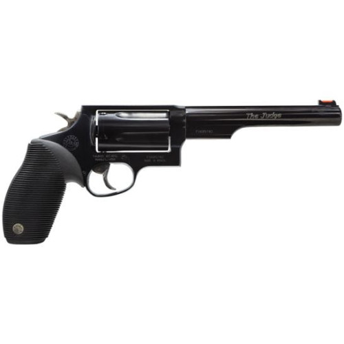 The "Taurus Judge" is so named because of the number of judges who carry it into the courtroom for their protection. Capable of chambering both .410 2-1/2" shotshell and .45 Colt Ammunition, this amazing combo gun is ideal for short distances - where most altercations occur, or longer distances with the .45 Colt ammo. We have finely tuned the rifling to spread the shot pattern at close quarters or to guide the .45 cal. bullet to the target. Fully customized with fixed rear sights, fiber optic front sights and Taurus Ribber Grips, the "Taurus Judge" is one decision-maker that lays down the law.